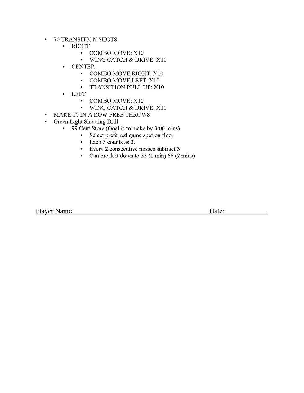 Player development is focused on slot charts, drills and Conditioning/ weight program. The chart wills include dates, shots attempted, shot made, and where the shots are being taken. Drill training is essential to fine tune player skills. Some of the drills that will be included are Passing, Shooting, Dribbling, Defense Conditioning and Rebounding.